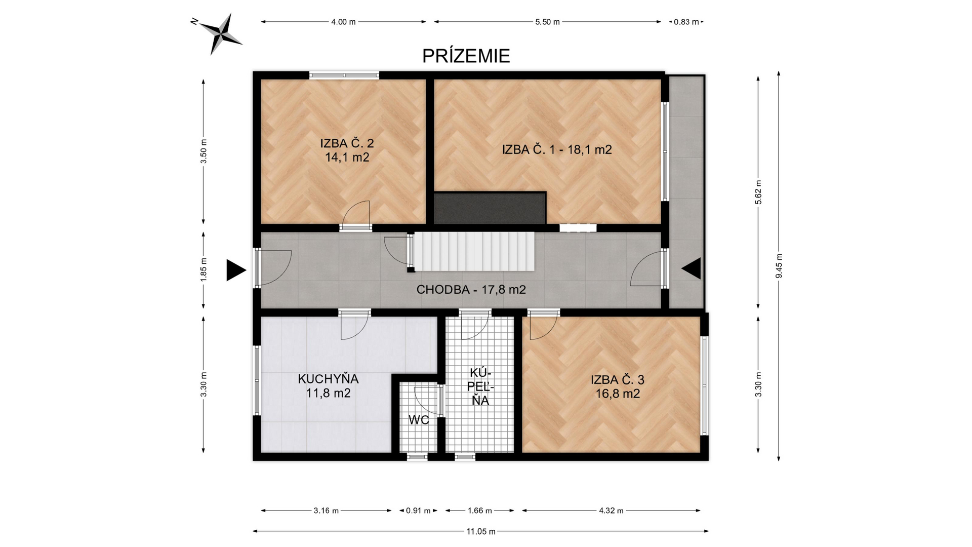 Prízemie vás privíta priestrannou, svetlou obývačkou s krbom, ktorá ponúka dostatok miesta na spoločné chvíle s rodinou alebo relax pri obľúbenom filme. Okrem toho tu nájdete dve izby, ktoré môžete využiť ako pracovňu, hosťovskú izbu alebo herňu pre deti, kúpeľňu s vaňou, toaltetu a kuchyňu.