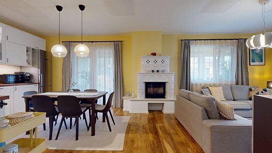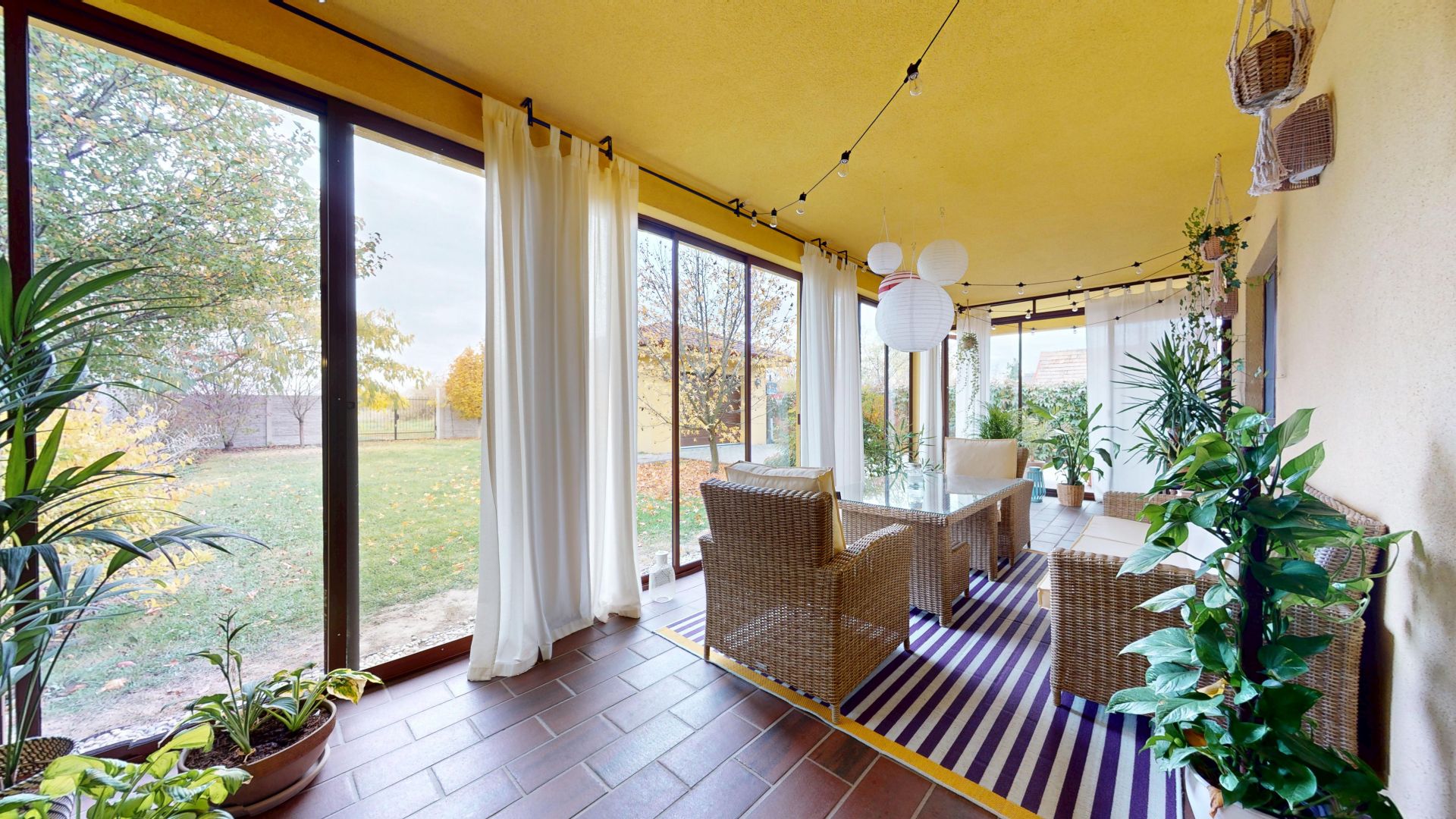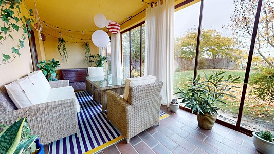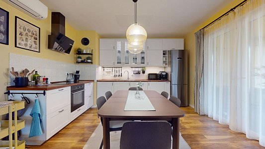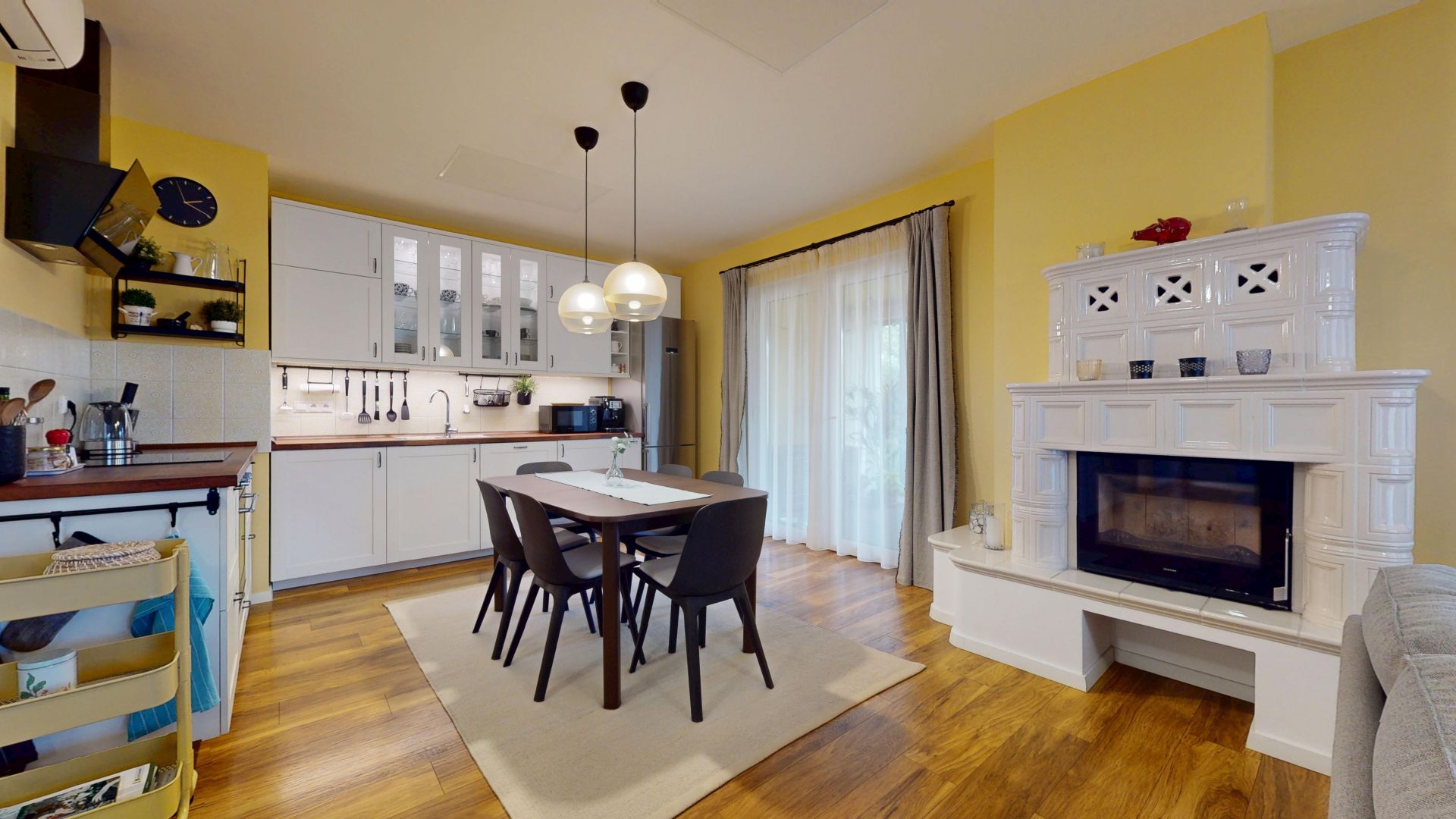 Zastavaná plocha domu je 175 m2, obytná plocha je 110 m2 + celoročná terasa so zasklením 32 m2. Dom je postavený z drevenej konštrukcie (izolácia vo vnútri steny s minerálnou vlnou v hrúbke 15 cm a izolácia vonkajšej steny s polystyrénom v hrúbke 10 cm), strecha je izolovaná v hrúbke 20 cm. Kúrenie je modenými stropnými infrapanelmi, ktoré sa dajú regulovať v každej izbe + kvalitným krbom v obývačke, teplá voda je z elektrického bojlera. Vo všetkých izbách sú invertorové klimatizácie (chladenie - kúrenie). V kuchyni je krásna kuchyská linka, elektrický sporák, keramická varná doska, moderný digestor a umývačka riadu. Okná sú plastové s energeticky úsporným trojsklom. Do domu je zavedená elektrina a obecná voda, v komore je zmäkčovač vody, ktorý zabráni usadzovaniu sa vodného kameňa a hrdze. Odpadová voda je riešená do žumpy.